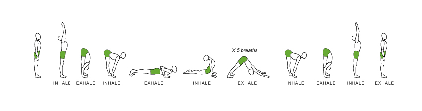 While there are many yoga poses that are perfect poolside, the Sun Salutation (Surya Namaskara A & B) is one that targets all parts of the body. It is a flowing sequence of 12 positions. Each time you flow through this sequence, synchronize your breath with the movements of your body.
